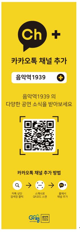 카카오톡 채널 추가로 공연 일정 정보를 빠르게 확인하실 수 있습니다. 놓치기 쉬운 다양한 음악역1939 프로그램 안내를 만나보세요. 일상에 음악이 스며드는 순간, 음악역1939 카카오톡 채널이 함께합니다. 지금 채널을 추가하고 음악이 머무는 공간, 음악역1939과 함께하세요!